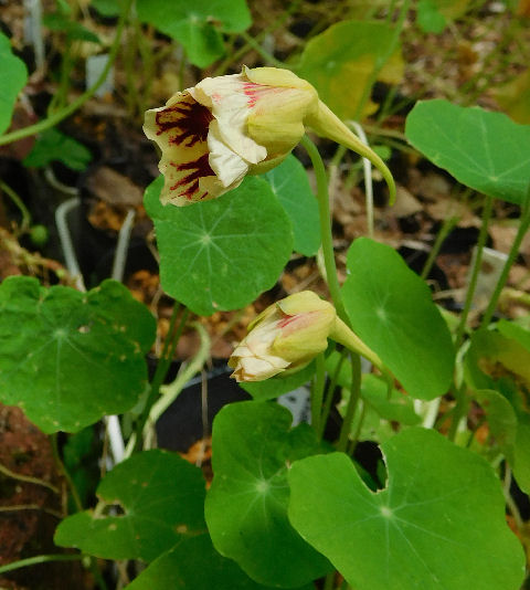 早春には発芽の兆しすら見えなかったポリフィラム,余計なものを植えてダメになったかなと不安だったが,ほどなくして発芽,すくすく育って今では鉢からはみ出して茎を伸ばしている.いずれのイモからも2本の茎が出ている模様.例年より元気じゃないの?と意外に思っている.