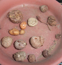 気になってポットに埋めて準備していた青ナスタらのイモをもう一度調べてみた.すると…干からびたもの,指で押すとフニャフニャしているもの等々.ダメイモを集めると写真のようになった.青ナスタだけでなくレピドムでダメになったものもあるし,インシスムでダメになったものもある.
