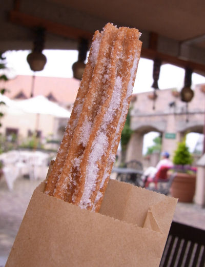 出店で「チュロス」と書かれた看板がふと目に留まった.「チュロス?聞いたことあるぞ~.そうだ,スペイン語講座で出てきたお菓子!」と思い出し,1つ購入したのが画像右のもの.(少しかじった後だけど(^^;(^^;) 1本350円で,プレーン(シナモン)とミルクがありプレーンを購入.買う時におじさんに「これどんなもの?」と聞いてみた.ここで売られているのでとりあえずはスイスのお菓子らしい.で,「そうですね,かりかりとしたあられのようなもの」とのお答え.