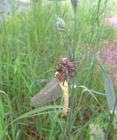ヤゴからトンボが出てきて羽を乾かしているところ.
