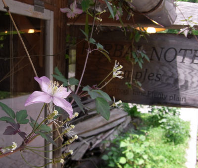 お店の看板の前には屋根を伝ったクレマチスが咲いていた.庭を拝見すると春とは大違いで,ジャングルのように緑が生い茂っていた.