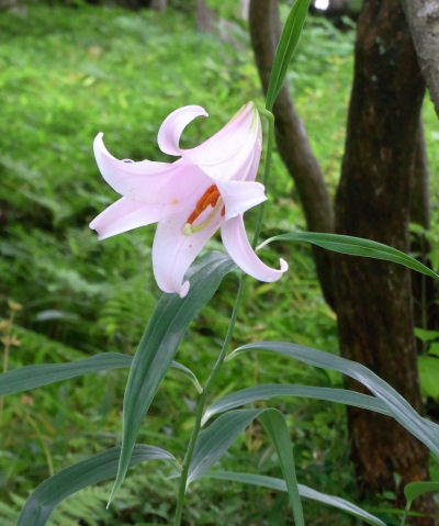 ユリって群生している光景を思い浮かべるが,ササユリは別.一人静かにたたずんでいるイメージ.葉がササのように細いのが特徴.