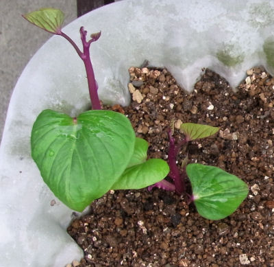 鉢はトロパの大鉢.蓼科行きで不在中にすっかり地上部は干からびていたもの.梅雨時で何となく土が過湿になってる気がするが….(~_~;)