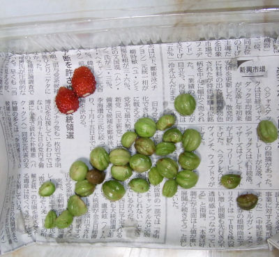 結果,ご覧の通りの収穫有り.左上の赤いのは,ワイルドストロベリーの実.つまむと甘くて美味しい.(^^)
