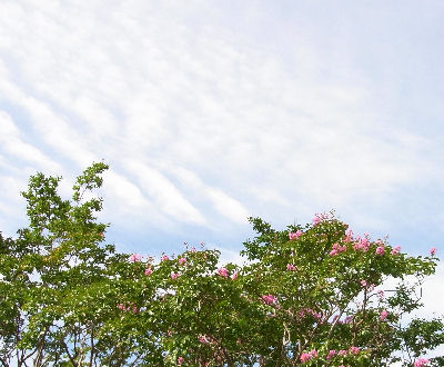 夏の花・サルスベリが咲いている上空に秋の筋雲.今朝の大阪は涼しくて過ごしやすかった.ずっとこんな日だったら良いのに,明日からまた湿った空気が入ってくるとか.まだ8月だし,仕方無い.早く本格的に涼しくなってくれないかなぁ….