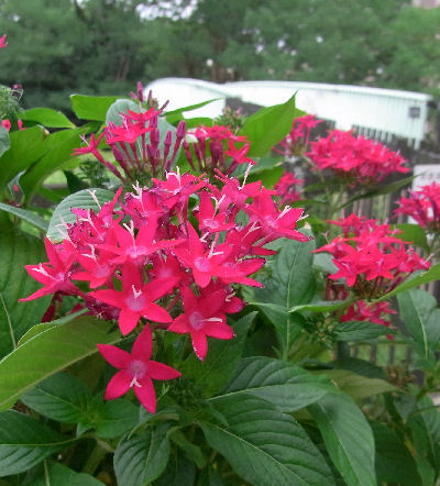 遊歩道沿いのコンテナに植えられたペンタス.