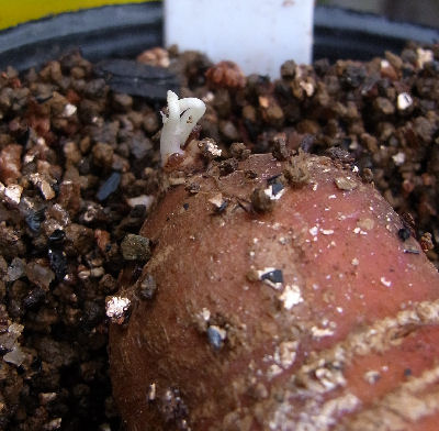 画像はT. pentaphyllum12号.土を掘ってみると発芽していた.他に9号と無印ペンタフィラムも発芽・発根を確認.これら3つは既に給水装置を付けて水やりを始めていたもので,地上部に芽が出てくるのが楽しみ.(^^)