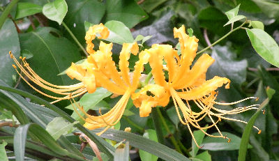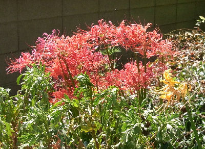 普通のヒガンバナは真っ赤だが,右の画像は一足先に咲いていたもの.(9/7撮影) 左画像では終わりかけの花が少し写っている.