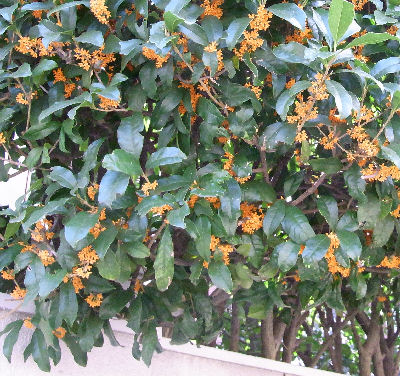 いつも散歩する時に通る道.近所のお宅でキンモクセイが満開になっている.