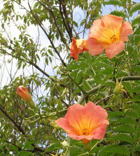 大阪では夏になればそこかしこで見かける花,ノウゼンカズラ.ノウゼンカズラ科の植物.つるがグングン伸びて先に花が咲く.色の濃淡はあるけれどオレンジ系の花がポピュラー.