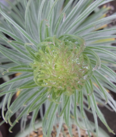 咲く気になったようだ…と書いた途端,花茎がグングン上がって来た.画像右は真上から見たところ.