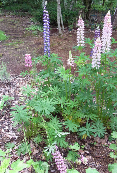 背の高いルピナスがやられていた.被害にあった花茎は3本,茎の途中から折れて重い花穂は下向きに.カットしようか迷った挙げ句支柱を立てることに.1本だけの支柱で3本の花穂を支えるよう,ビニタイで花茎を固定.これで数日保ってくれたら良しとしよう.(^^)