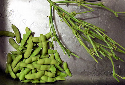 で,画像右は枝豆.obiさんによると両端は切らないとのこと.ならば…と今回は枝の付け根だけカットし,もう片方はカットせず.そりゃこの方がずっと時間短縮で助かる.(^o^) そして感心したのが枝豆の茎.実を取り去ってもこんなに立派なんだ~と,ガイコツ状態の記念撮影.ウチのとえらい違い.畑でちゃんと作られたモンはさすがに違うなぁ~と思った次第.