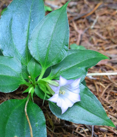 ややブルー味を帯びた白.これは日陰で咲いていた株.秋には真っ赤な実がなって美しい.名前の通りツル性で地面をのたうっている.