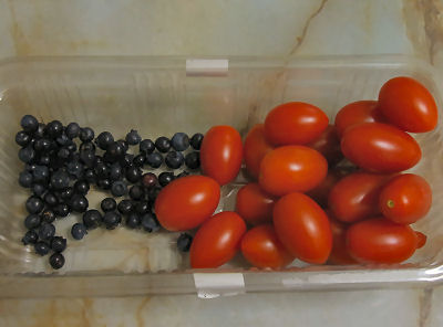 ブルーベリーとミニトマトを収穫.いよいよブルーベリーは終わりになってきた.ミニトマトはまだ色づいていない実がある.涼しくなる前に色づくんだろうか,猛暑続きが幸いしてたくさん収穫出来た.猛暑も悪いことばかりでは無さそう.(^o^)