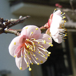 あちこちから届く梅のたより.だが,うらやましがる前に身近なところでも梅は咲いていた.(^^; 先日見たのは淡いピンクの八重花だったが,今日は一重の薄ピンク花.