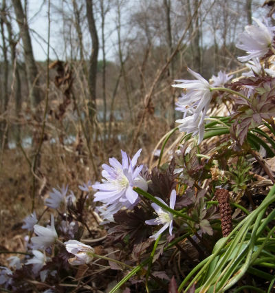 キクザキイチゲの群落はポツポツと点在しており,白花・青花の二種類がある.