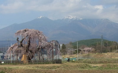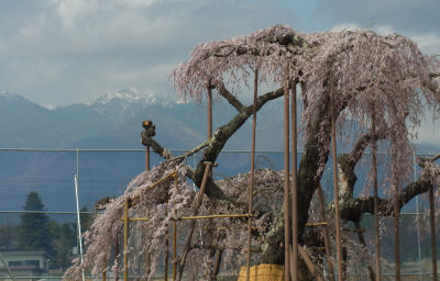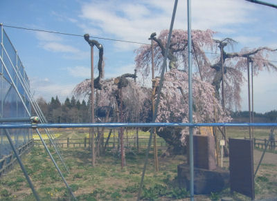 ただ,老齢の桜を保護するためにブルーの防風ネットが周囲にはりめぐらされており,景色としてはマイナス・ポイント.また,今までは桜のすぐそばまで車で来ること出来たが,最盛期のためか少し離れた場所に駐車場が設けられていた.遠景の桜を見ることができてちょうど良かったけど.(^o^)