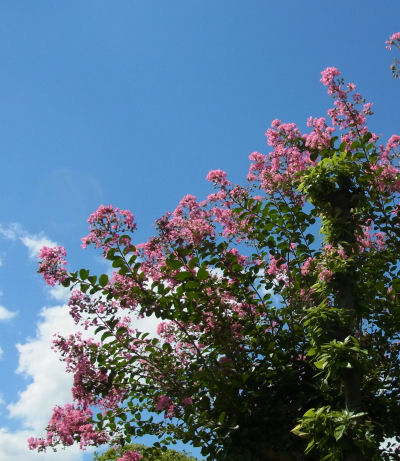 空の色はブルーが濃くなり秋の気配.澄んだ秋空をバックに夏の花のサルスベリが咲いている.