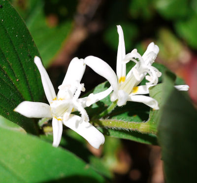 この株,上段は既に咲き終わり,今は中段の花が開花中.隣の茎を避けて斜め上から撮ったところ.