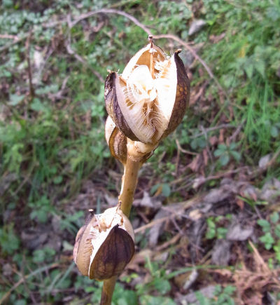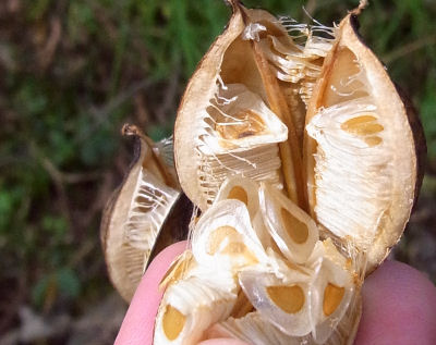 パカッと割れた中にはぎっしり薄っぺらい種が詰まっている.