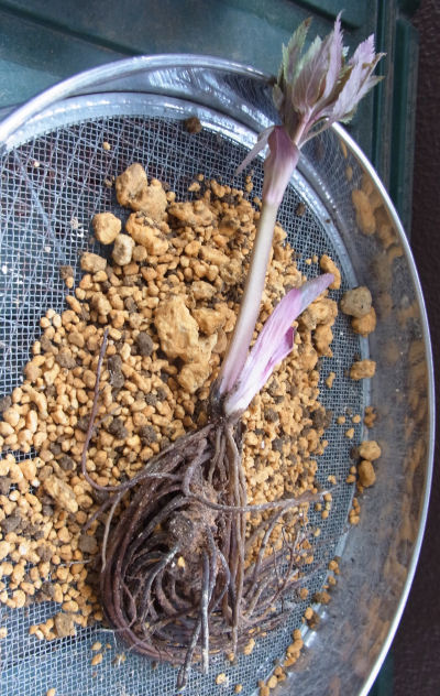 まずポットから出してみる.やけにポットが新しい.根が丸めて入れられた雰囲気.きっと展示即売会直前に新しいポットに入れ替えた感じ.