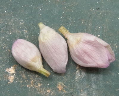 画像中央と右は大きな花芽を無理矢理こじあけてみたところ.もうちゃんとおしべもめしべも出来ている.この桜色の花弁がなんとも言えないはかなげな美しさ.