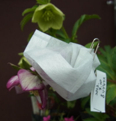 ピンセットでリグリクスのおしべを数本失敬して,めしべにコチョコチョ.画像左は花粉を付けた様子.画像中央はそのアップ.柱頭に花粉が乗っている.これだけ付けておいたら大丈夫かな?そして再度お茶袋をかけて花茎にメモも付けておいた.