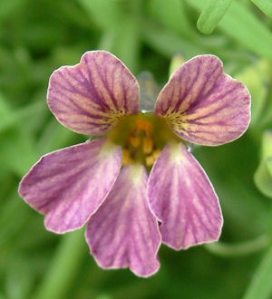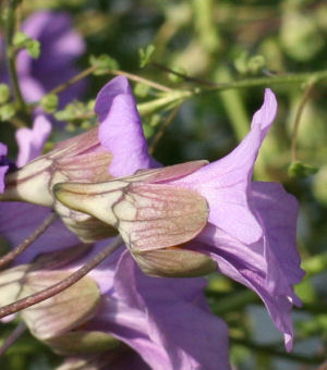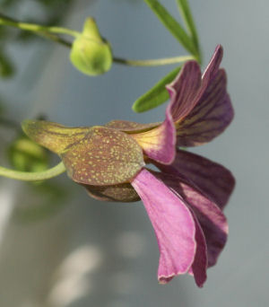 そこで画像の花の「ガクと距(きょ)」に注目.画像二番目と,三番目の画像のツボミの方を見比べると,とても良く似ているのに気づく.赤紫っぽい暗い色の地にポツポツと点々が見える.これは青花ナスタの特徴.ちなみに四番目が一般的なレピドムのガクと距の様子.見たとおり,青花ナスタとは全然雰囲気が違う.