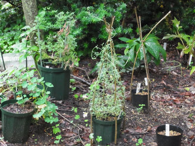 下中央と右(黒ポリポット;既に株は枯れている)T.sessilifolium.中央は開花が始まった1号.後ろにもsessilifoliumが居る.その横の右端にはT.speciosumの新芽が出ている(ほとんど見えないが).