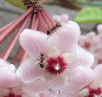 挿し木でスタートしたホヤ.2~3年後に開花.以来,毎年適当に咲いている.花はまるで陶器で出来ているかのような質感.このツボミも独特な雰囲気で面白い.五角形で花弁が折りたたまれた感じ.傘が開いたような形で房になり,下向きに花が咲く.ふと見ると開花した花にアリたちが来ていた.きっと甘い蜜でも出ていたんだろう.ん~,私も味見したら良かった.