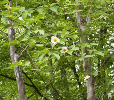 地面にたくさん花が白い落ちているな…と思って上を見上げると,ナツツバキが開花中.