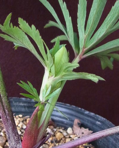 蓼科から連れ帰ったヘレボ・ボッコネイに花芽確認.