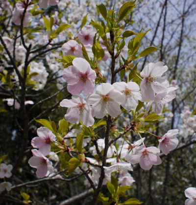 ソメイヨシノと違い,花が咲きつつ葉も出ている.