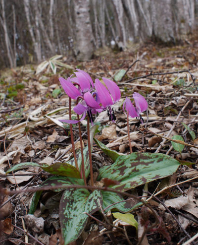 そんな中,ポツポツとピンクのものが見えて近づいてみるとカタクリだった,という訳.