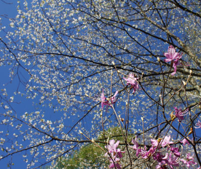 ミツバツツジは凍害にあった花芽が干からび,花の少ない状況で満開を迎え,そろそろ終盤.