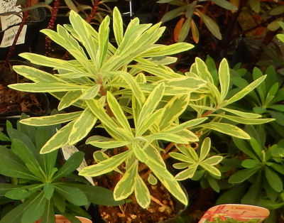 苗ケースにユーフォルビアばかり集められている一角があり,ひときわ目立っていたのが画像の株.明るい葉色が目を惹く.そして名札を見てびっくり,なんと日野春ハーブガーデンの苗だった.(@_@) こんなトコにも進出してたのか~.