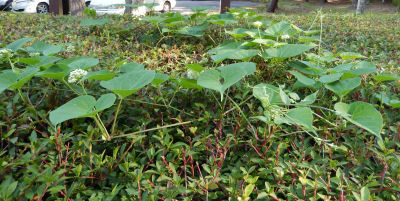 近所の植え込みから出て来ているつる植物がある.
