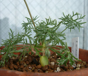 昨年秋に種まき.ずっとビニールポットのままだったが3株のうち1株に花芽が付いたので,コリダリスと同様,急遽駄温鉢に植え替えた.