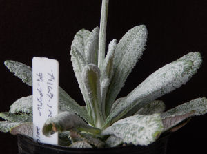 実際の花色はもう少し濃い紫.それにしても粉ふきいもみたいに粉を吹いているのが凄い.乾燥肌か?(~_~;)