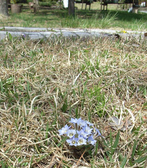 このリンドウ,本当に小さい.高さは5センチあるかないか.この株はたまたまたくさんの花が付いているが,1つや2つだけ咲いている株も多い.それでも地面にこの淡い色があると目立つ.リンドウ?スミレ?と見極めながら歩くのも楽しい.それでも勢力範囲は圧倒的にスミレの方が大きい.パッと見ただけでも,スミレは日陰でも平気だがリンドウは日陰には生えていない.リンドウの方が限られた条件の所でしか出てこられないのだろう.