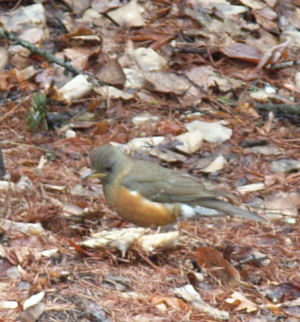 玄関までのアプローチにアカハラが居た.先日見た子と同じかどうかは分からない.ほんの2m程しか離れていない距離.あまり警戒心が無いのか?そっと近づきながら様子を観察.雨上がりで虫が地表に出てきているのか,しきりに地面をつついている.はねるようにして場所を移動し,地面をつつく動作の繰り返し.
