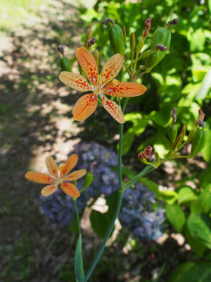 後ろにはアジサイが咲いている.ここはアジサイ・コーナーだったが,このヒオウギ,どこからやってきたんだろう?