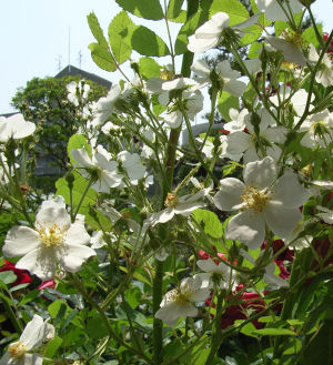 どうやら台木のノイバラが伸びてきて開花した模様.こんな風景は初めてみたが,結構起こりえるみたい.元来の株が負けては困るので,根元からこの茎をバッサリ.