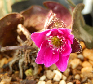 濃いピンクの雪割草がようやく開花.