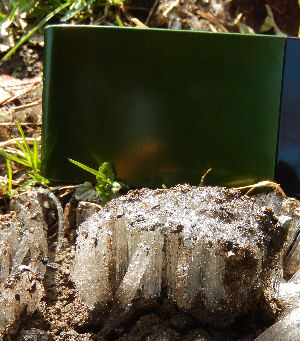 朝の散歩途中,尖石遺跡の公園を歩いていて見つけた霜柱.高さ2cm以上はあっただろうか.立派な霜柱だったのでガラケーを横に置いて記念撮影.