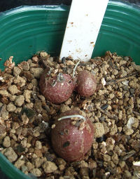 蓼科へ行く前にポット植えしたレピドムのイモ,一週間足らずで一部発芽開始.台風の影響による雨で,たくさんのイモが過湿でダメになってしまった.横着してポットの底に鉢底石を入れない方法をとってみたが,これはダメ.一気に過湿になってしまう.次回は他の方法を考えてみよう.