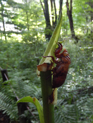 鹿に花芽を喰われたウバユリの先端にセミの抜け殻がついていた.