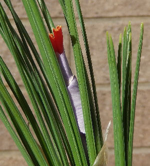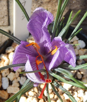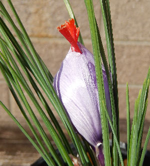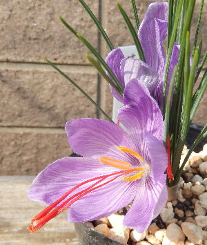 蓼科で地植えサフランが咲いていたのに大阪に戻ると全然気配無し.それで日なたに置いたところ突然花芽が出現,そして数日で開花.やはり太陽は偉大.
