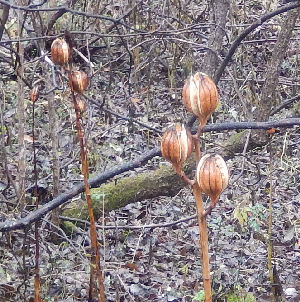 ユリの種って鳥さんたちの食べ物になるのですね.シジュウカラはワンサと居るけど,つついている姿は見た事無いです.まだまだ他に美味しい物がたくさんあるのでしょう.でも他の実が無くなる頃には,ウバユリの種も飛んで無くなってるような気がする…(^^;